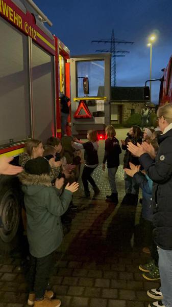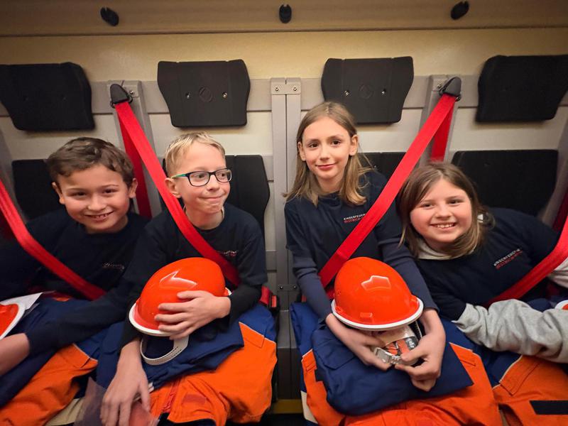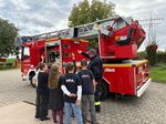 In zwei Gruppen haben die Kinder das Fahrzeug Stück für Stück kennengelernt, Schläuche ausgerollt und ausprobiert, was dazugehört. Das absolute Highlight: Jedes Kind durfte mit der Drehleiter hoch