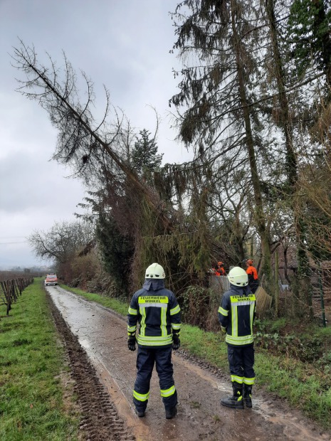 Am heutigen Sonntag wurde die Feuerwehr Oestrich-Winkel zweimal zum Einsatz wegen des Sturmes alarmiert. Gegen 15 Uhr wurde in Oestrich Am Markt ein Teil eines Hausdaches abgedeckt. Hier konnte die Feuerwehr nur absperren, da die Böen noch viel zu stark waren, um am Dach tätig zu werden. Später konnte ein ortsansässiger Dachdecker notdürftig das Dach verschließen. Kurz nach 18:30 Uhr wurde ein querliegender Baum oben auf den Waldackergrundstücken - der den Weg komplett versperrte - über die Polizei gemeldet. Bei der Anfahrt des Einsatzortes musste die Feuerwehr noch ein herumfliegendes Trampolin in Nähe der Honigwiese sichern. Die querliegende Tanne wurde mit Hilfe einer Motorsäge kleingeschnitten und der Weg war schnell wieder frei geräumt.