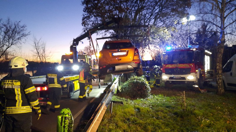 Am Montagnachmittag kam es zu einem Verkehrsunfall durch einen PKW, der auf der B42 in Höhe des Grauen Hauses in Winkel auf der Leitplanke zum Stehen kam. Ein älterer Fahrer kam mit seinem erst neun Monate alten Fahrzeug von der Fahrbahn ab und rutschte oberhalb der Leitplanke etwa 50 Meter entlang und wurde durch eine größere Hecke abgebremst - zehn Meter weiter und die Rutschpartie wäre an einem großen Baum zu Ende gewesen. Glücklicherweise konnten beide Insassen das Fahrzeug unverletzt verlassen. Die Feuerwehr Winkel wurde aufgrund auslaufender Betriebsstoffe von der Polizei nachgefordert. Neben der Absicherung der Einsatzstelle wurde der Brandschutz sichergestellt, die auslaufenden Betriebsstoffe abgestreut und später leuchtete die Feuerwehr die Einsatzstelle noch aus. Beim Anheben des verunfallten Opels durch den Abschleppdienst aus Wiesbaden trat dann aus dem beschädigten Tank Kraftstoff aus, der von der Feuerwehr aufgefangen wurde. Seitens Hessen Mobil wurde die Unfallstelle an der beschädigten Leitplanke entsprechend verkehrstechnisch abgesichert. Die Höhe des Sachschadens am Fahrzeug sowie der Leitplanke stand bei Einsatzende noch nicht fest. Während des über zweistündigen Einsatzes kam es teilweise zu Verkehrsbehinderungen. Neben der Feuerwehr Winkel waren die Polizei aus Rüdesheim sowie die Ordnungspolizei der Stadt Oestrich-Winkel und Hessen Mobil vor Ort.