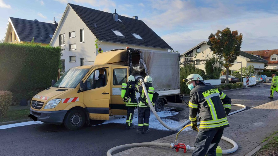 In der Nacht zu Sonntag wurde kurz vor 1 Uhr in der Rhabanusstraße in Winkel ein brennendes Fahrzeug gemeldet. Bei Ankunft der Feuerwehr stand der gesamte Motorraum des Kleintransporters im Vollbrand und die Flammen schlugen schon bis zur Höhe des Daches des direkt angrenzenden Wohnhauses. Ein Anwohner hatte noch vor Eintreffen der Feuerwehr mit einem Feuerlöscher kurzfristig die Flammen eindämmen können. Die Feuerwehr bekämpfte mit einem Angriffstrupp unter Atemschutz den Brand. Das Feuer war schnell gelöscht - die Nachlöscharbeiten mit Schaum und die Kontrolle mittels einer Wärmebildkamera dauerten noch einen Moment. Der gesamte Motorraum und Fahrerraum wurden durch die Flammen völlig zerstört. An dem Wohngebäude wurden ein Fenster und die Außenwand durch die Wärmestrahlung beschädigt. Neben der Feuerwehr mit 18 Einsatzkräften war die Polizei vor Ort.